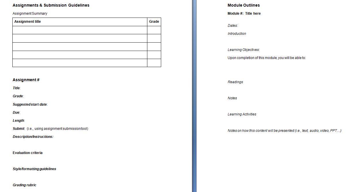 In general, I try to be as flexible as possible with course developers as they sometimes struggle to use this document, either because they are not used to planning courses out like this, or because they are not linear thinkers. I explain to them that the blueprint development process is a team process and that this model gives the other team members a clear picture of the course, one module (or unit or topic) at a glance. If they are confused by or uncomfortable with any of the language I use in the template, we discuss it in person (or over the phone) and I make minor adjustments to help them over any initial angst they may have.